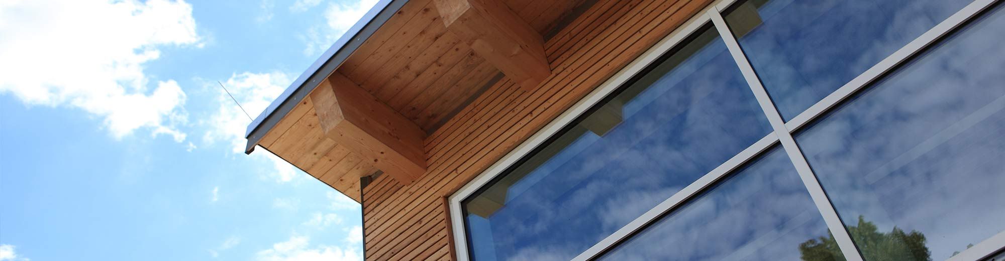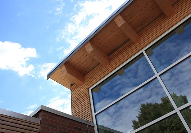 Ein Pultdach eröffnet dem Bau eine raumhohe Fensterfront zum Norden für größtmöglichen Lichteinfall. Die Fassadengestaltung aus horizontalen Holzleisten und Verblendmauerwerk fügt den Bau harmonisch ins umgebende Gesamtbild ein.