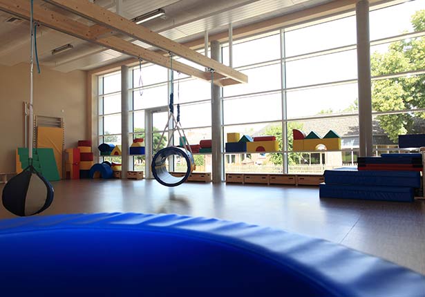 Mit ausreichend Platz zum Toben und Spielen wird der Bewegungsraum von den Jüngsten für sportliche Aktivitäten genutzt. Neben mobilen Geräten erweitert eine XXL Spielschiene das Angebot durch den Einsatz von Schaukeln und Netzen.