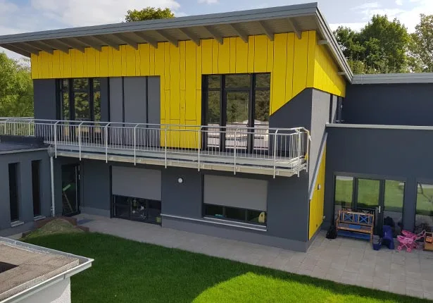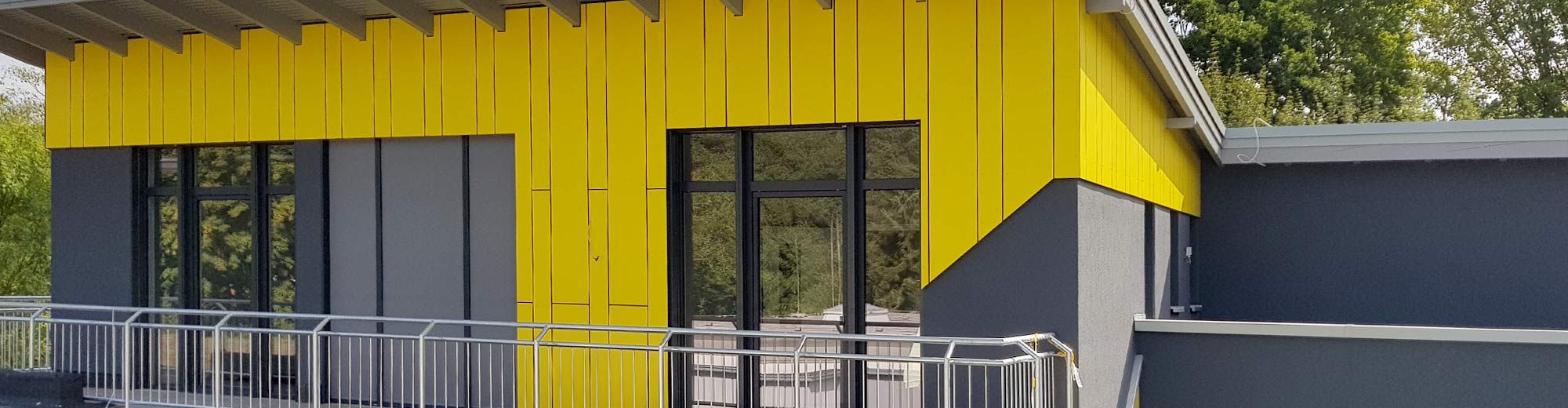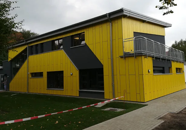 Den oberen Abschluss bildet ein Pultdach. Die Fassade gestaltet sich aus zwei Materialien: Ein „Band“ aus anthrazitem WDVS durchzieht senkrecht verlaufende Fassadentafeln in einem kräftigen Gelb. So werden die unregelmäßig verteilten Fenster eingefasst und miteinander verbunden.
