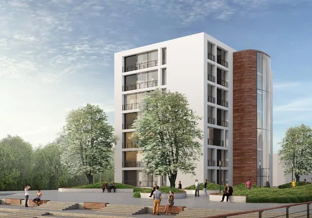 Fünf freistehende Solitaire mit je zehn Wohnungen auf fünf Geschossen orientieren sich zur Hafenkante und bilden eine Promenade, seitlich ausgewölbte Holzfassaden greifen in Material und Formsprache das nautische Thema auf. Die Abstände zwischen den Solitairen spenden ausreichend Sichtachsen zu einem dahinter gelegenen Riegel, der das Grundstück zur Straßenseite abschließt. Zentrale Grünanlagen dienen als halböffentliche Flächen, die durch ein Café ergänzt werden.