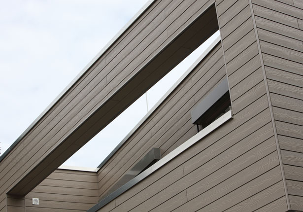 Die Holz imitierende Fassade spiegelt die Materialität der Bestandsgebäude wider, definiert aber auch den Anbau als eigenständiges Segment. Dies wird durch das verglaste Treppenhaus, das Alt- und Neubau verbindet, unterstrichen.