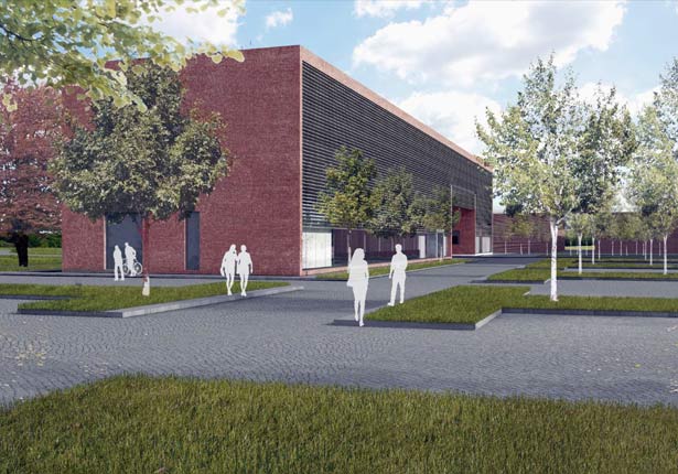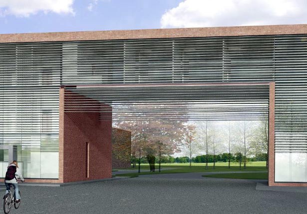 Das Verwaltungsgebäude beinhaltet neben den Büros auch die Zugangskontrolle der Mitarbeiter und Fahrzeuge. Es bildet eine städtebauliche Ergänzung der Zaunanlage als Übergang zum gesicherten Bereich.
